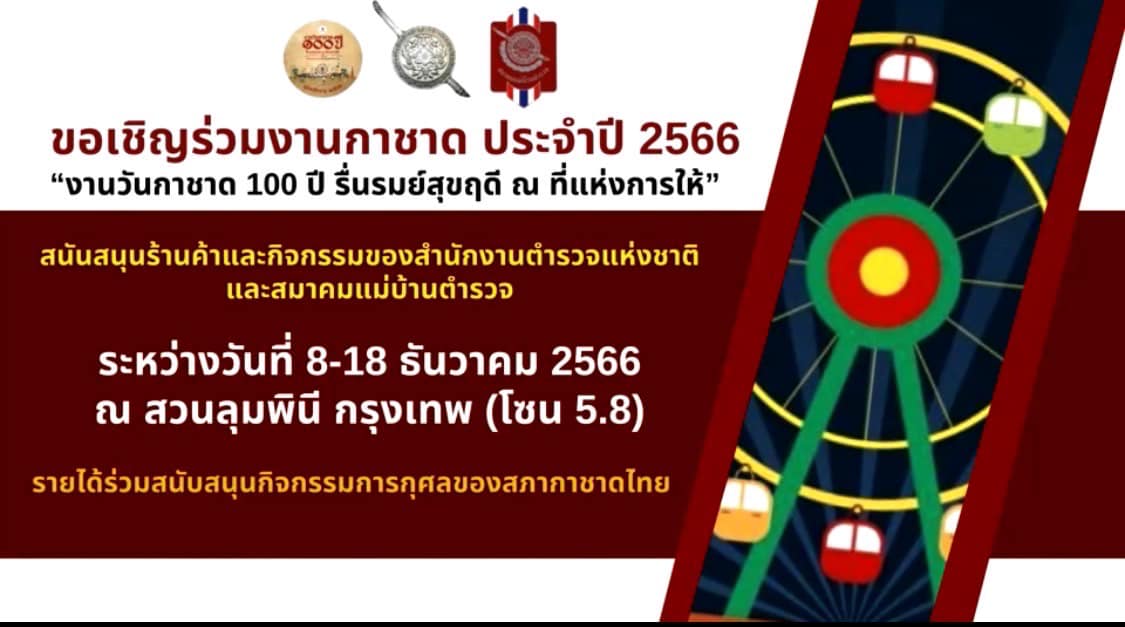 สำนักงานตำรวจแห่งชาติ และสมาคมแม่บ้านตำรวจ ขอเชิญชวนเข้าร่วมงานกาชาดประจำปี 2566 ระหว่างวันที่ 8 – 18 ธันวาคม นี้ อิ่มบุญ อิ่มใจไปพร้อมกัน