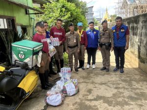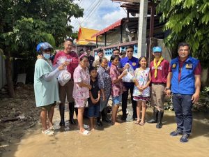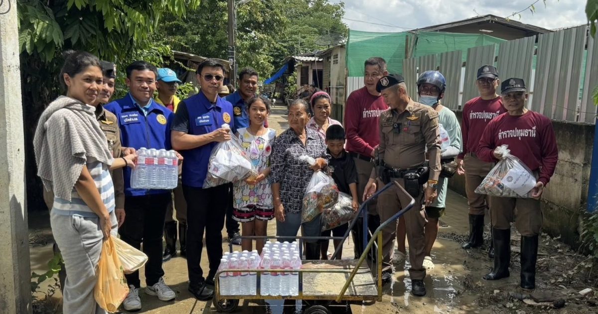 ร่วมกับผู้นำชุมชน ร่วมกันแจกจ่ายน้ำดื่มและข้าวสารอาหารแห้ง ให้แก่ประชาชน ชุมชนเกาะเกรียง ม.5 และชุมชนสามศาล ม.6 ต.บางคูวัด อ.เมืองปทุมธานี จว.ปทุมธานี ที่ได้รับผลกระทบจากแม่น้ำเจ้าพระยาเอ่อล้นนอกริมตลิ่งแนวคันกั้นน้ำ