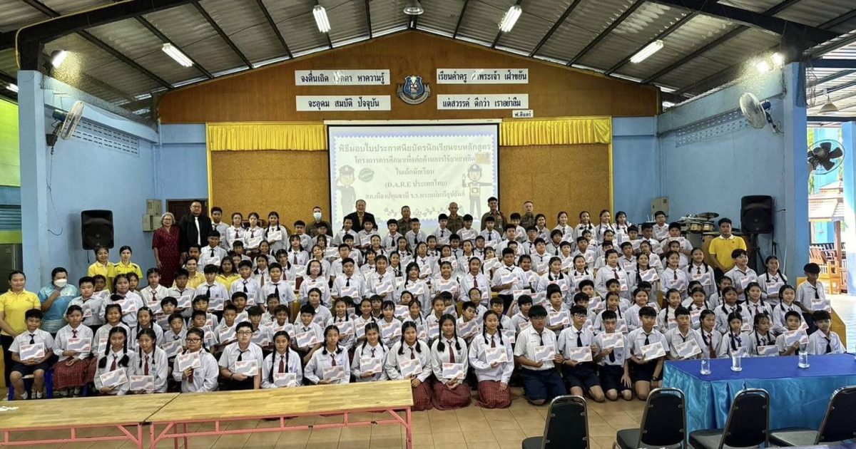 จัดพิธีมอบใบประกาศนียบัตรนักเรียนที่จบหลักสูตรโครงการการศึกษาเพื่อต่อต้านการใช้ยาเสพติด(D.A.R.E.ประเทศไทย) จำนวน 158 คน ณ รร.พระแม่มารีอุปถัมภ์ ต.บางเดื่อ อ.เมือง จ.ปทุมธานี