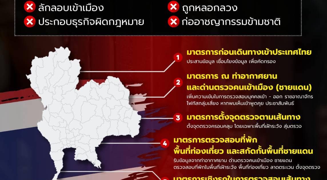 2. มาตรการ ณ ท่าอากาศยาน และด่านตรวจคนเข้าเมือง (ชายแดน) : เพิ่มความเข้มงวดในการตรวจสอบบุคคลเข้า-ออกนอกราชอาณาจักร โฟกัสกลุ่มเสี่ยง หากพบเห็นให้รีบดำเนินการซักถาม และประชาสัมพันธ์ มาตรการติดตั้งกล้อง License Plate และเชื่อมโยงกล้องวงจรปิด (ระบบ AI) ติดตั้งป้ายประชาสัมพันธ์ (แจ้งเตือน)