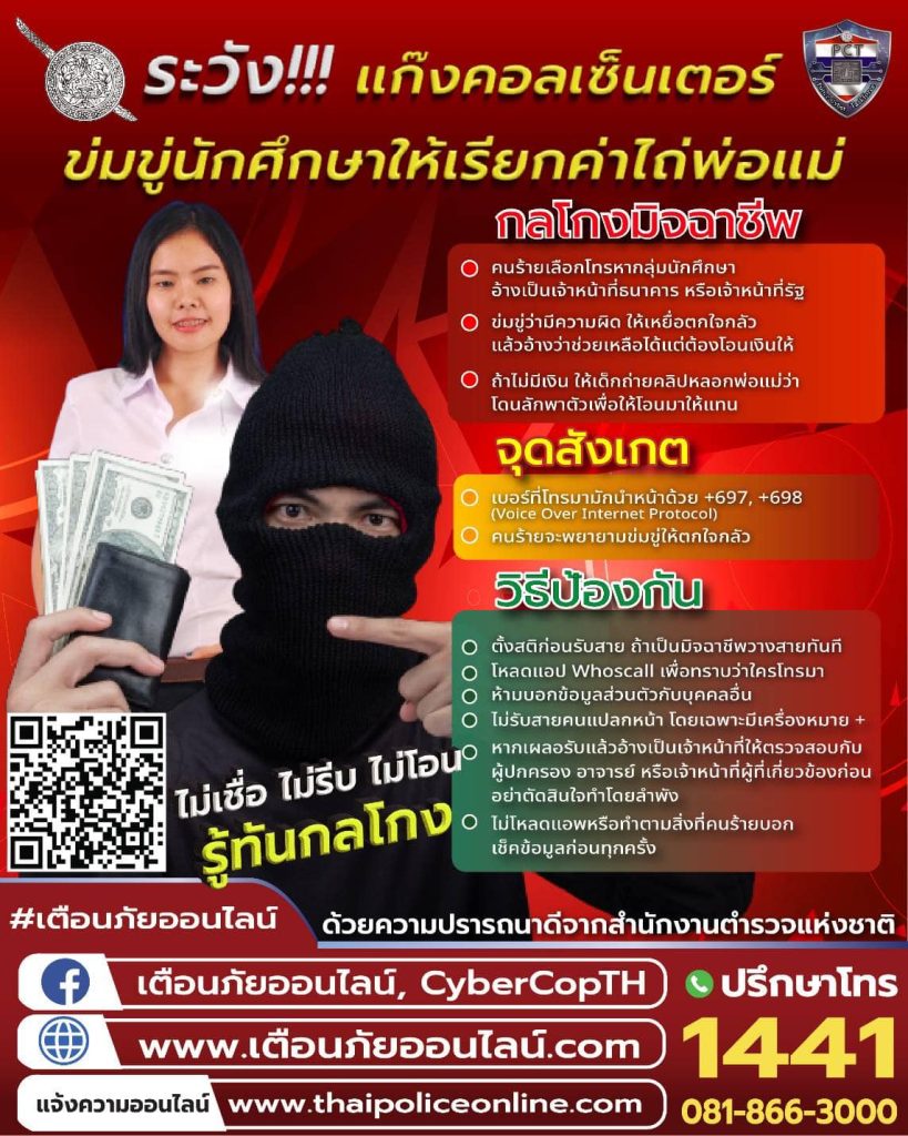 ระวัง!!! แก๊งคอลเซ็นเตอร์ ข่มขู่นักศึกษาให้เรียกค่าไถ่พ่อแม่