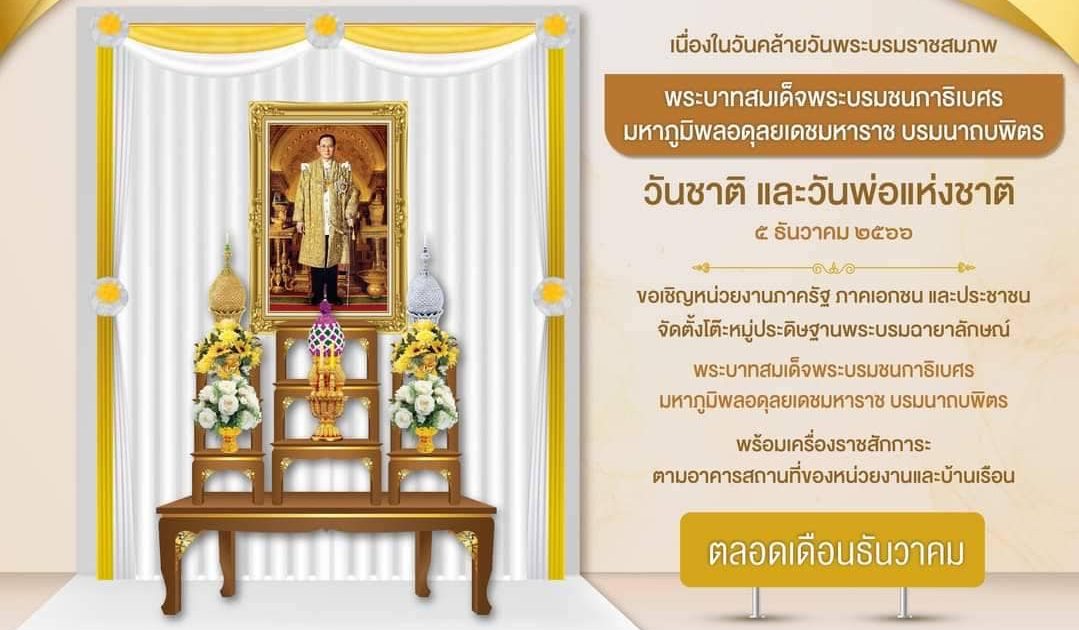 ขอเชิญหน่วยงานภาครัฐ ภาคเอกชน และประชาชน จัดตั้งโต๊ะหมู่ประดิษฐานพระบรมฉายาลักษณ์พระบาทสมเด็จพระบรมชนกาธิเบศร มหาภูมิพลอดุลยเดชมหาราช บรมนาถบพิตร พร้อมเครื่องราชสักการะ ตามอาคารสถานที่ของหน่วยงานและบ้านเรือน ตลอดเดือนธันวาคม