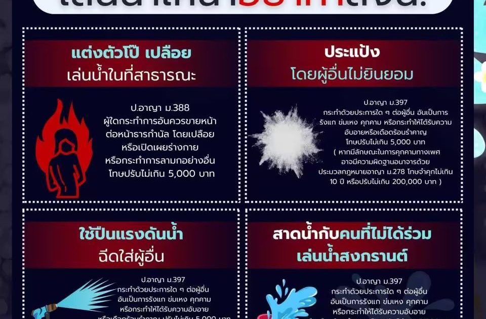“เทศกาลสงกรานต์” ช่วงเวลาแห่งความสนุกที่คนไทยและนักท่องเที่ยวรอคอย ทุกปีถนนหนทางเต็มไปด้วยรอยยิ้มและสายน้ำเย็นฉ่ำ แต่ในความสนุกนั้น บางพฤติกรรมที่ดูเหมือนเรื่องเล็ก ๆ อาจกลายเป็นเรื่องใหญ่ได้ถ้าฝ่าฝืนกฎหมาย จากข้อมูลของสำนักงานตำรวจแห่งชาติ มีพฤติกรรมที่ไม่ควรทำเด็ดขาด เพราะนอกจากจะผิดกฎหมายแล้ว ยังอาจบานปลายจนถึงขั้นเสียอนาคตได้