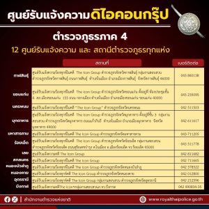 สำนักงานตำรวจแห่งชาติเปิด “ศูนย์รับแจ้งความ คดี THE iCON GROUP” ทั่วประเทศ 9 ศูนย์ใน กทม. พื้นที่ดูแลของกองบัญชาการตำรวจนครบาล และ 76 ศูนย์ ทุกจังหวัดในพื้นที่การดูแลของตำรวจภูธรภาค 1 – 9 เพื่ออำนวยความสะดวกให้แก่ประชาชนผู้เสียหาย และลดความยุ่งยากในการแจ้งความ
