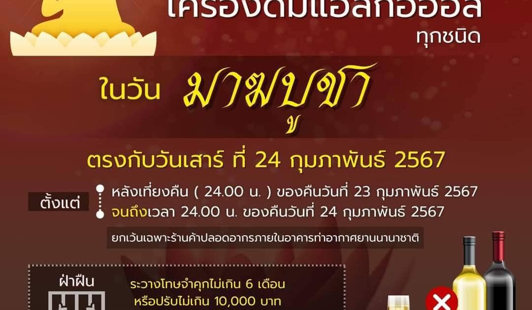 สำนักงานตำรวจแห่งชาติขอประชาสัมพันธ์แจ้งเตือนไปยังผู้ประกอบการร้านค้า และพี่น้องประชาชน ให้งดจำหน่ายเครื่องดื่มแอลกอฮอล์ทุกชนิด ทั้งชนิดขายส่งและขายปลีกทั่วราชอาณาจักร ตลอด 24 ชั่วโมง คือหลังเวลา 24.00 น. ของคืนวันที่ 23 ก.พ.67 ไปจนถึงเวลา 24.00 น. ของคืนวันที่ 24 ก.พ.67 ยกเว้นเฉพาะร้านค้าปลอดอากรภายในอาคารท่าอากาศยานนานาชาติ