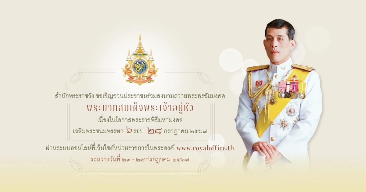 สำนักพระราชวัง ขอเชิญชวนประชาชนร่วมลงนามถวายพระพรชัยมงคลพระบาทสมเด็จพระเจ้าอยู่หัว เนื่องในโอกาสพระราชพิธีมหามงคลเฉลิมพระชนมพรรษา ๖ รอบ ๒๘ กรกฎาคม ๒๕๖๗ ผ่านระบบออนไลน์ ที่เว็บไซต์หน่วยราชการในพระองค์ www.royaloffice.th ระหว่างวันที่ ๒๓ – ๒๙ กรกฎาคม ๒๕๖๗