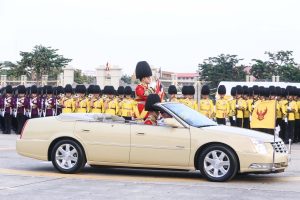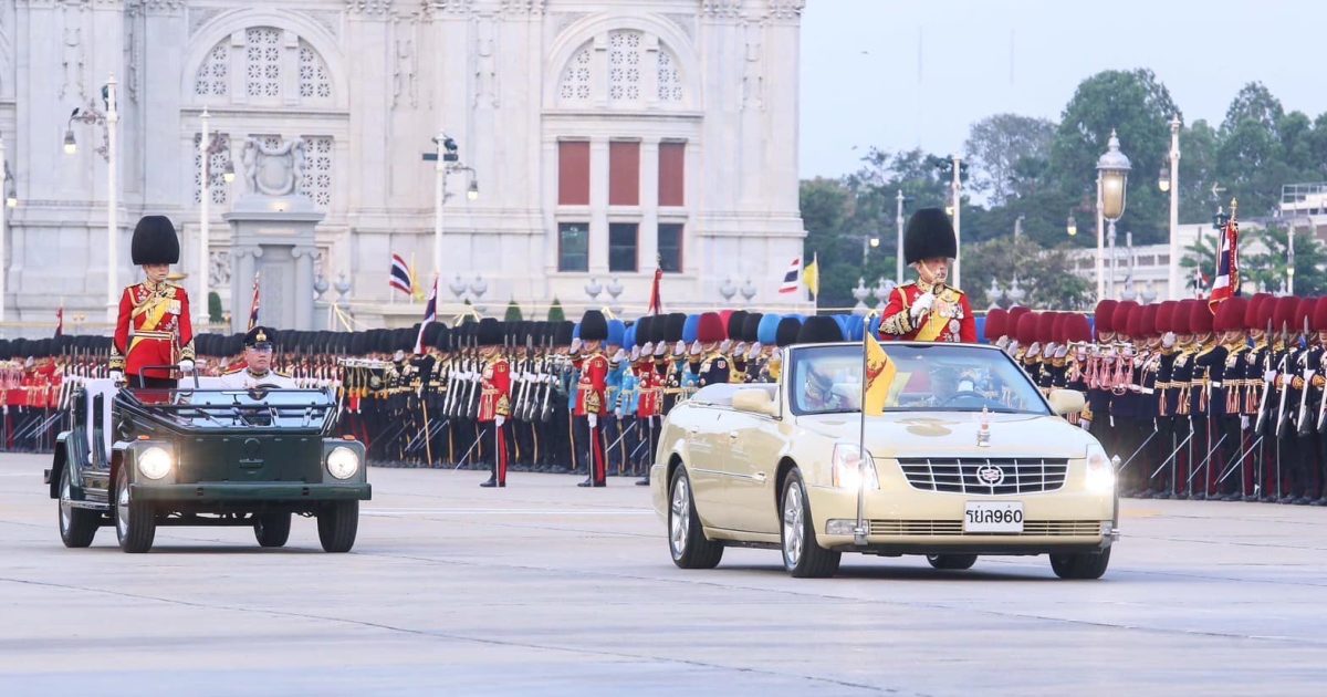 พระบาทสมเด็จพระเจ้าอยู่หัวประทับยืนบนรถยนต์พระที่นั่ง ทรงตรวจพลสวนสนามโดยรถยนต์พระที่นั่งจำนวน 4 กรม 10 กองพัน ซึ่งประกอบด้วย กรมทหารรักษาวังมหาดเล็กราชวัลลภรักษาพระองค์ กองบัญชาการทหารมหาดเล็กราชวัลลภรักษาพระองค์ หน่วยบัญชาการถวายความปลอดภัยรักษาพระองค์, กรมนักเรียนนายร้อยรักษาพระองค์ โรงเรียนนายร้อยพระจุลจอมเกล้า, กรมนักเรียนนายเรือรักษาพระองค์ โรงเรียนนายเรือ, กรมนักเรียนนายเรืออากาศรักษาพระองค์ โรงเรียนนายเรืออากาศนวมินทกษัตริยาธิราช, กองพันทหารราบที่ 1 กรมทหารราบที่ 31 รักษาพระองค์ , กองพันทหารอากาศโยธิน 3 กรมทหารอากาศโยธิน รักษาพระองค์ หน่วยบัญชาการนาวิกโยธิน , กองพันทหารม้าที่ 25 กรมทหารม้าที่ 4 รักษาพระองค์, กองพันทหารราบที่ 2 กรมทหารราบที่21 รักษาพระองค์, กองพันทหารปืนใหญ่ที่ 102 กรมทหารปืนใหญ่ที่ 2 รักษาพระองค์, กองพันทหารราบที่ 1 รักษาพระองค์ กรมทหารราบที่ 1 และกองพลนาวิกโยธิน หน่วยบัญชาการนาวิกโยธิน