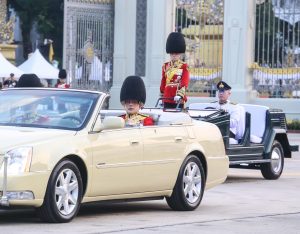 พระบาทสมเด็จพระเจ้าอยู่หัว และ สมเด็จพระนางเจ้าฯพระบรมราชินี เสด็จพระราชดำเนินไปยังรถยนต์พระที่นั่ง เพื่อประทับรถยนต์พระที่นั่งเสด็จออกจากพระลานพระราชวังดุสิตกลับพระที่นั่งอัมพรสถาน พระราชวังดุสิต ระหว่างที่รถพระที่นั่งกำลังเคลื่อนเข้าสู่ทางประตูภูธรลีลาศนั้น รองผู้บังคับกองผสมนำกำลังพลสวนสนามฯ และผู้ร่วมในพิธีเปล่งเสียงทรงพระเจริญดังกึกก้องทั่วพระลานพระราชวังดุสิต
