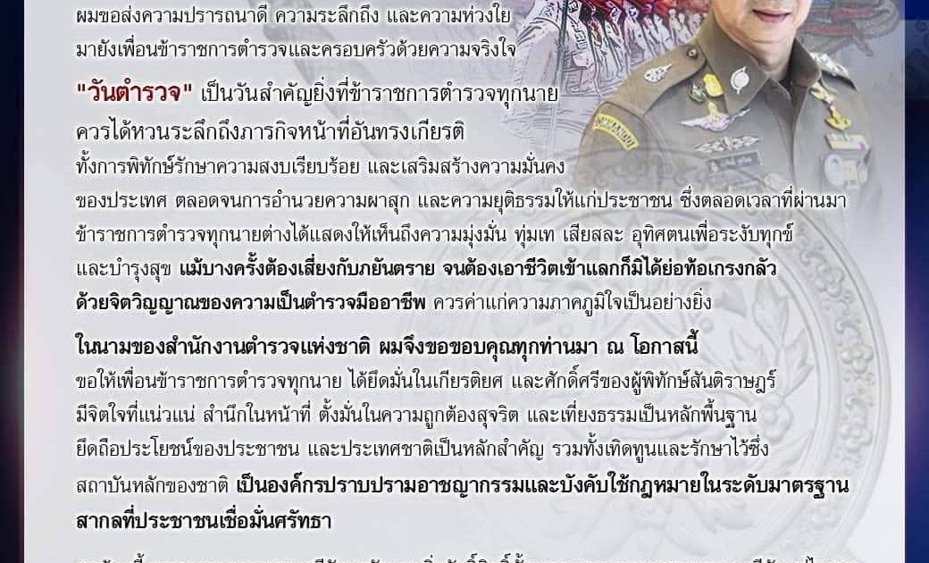 เนื่องในโอกาสวันตำรวจ ได้เวียนมาบรรจบครบอีกวาระหนึ่ง ผมขอส่งความปรารถนาดี ความระลึกถึง และความห่วงใยมายังเพื่อนข้าราชการตำรวจและครอบครัวด้วยความจริงใจ