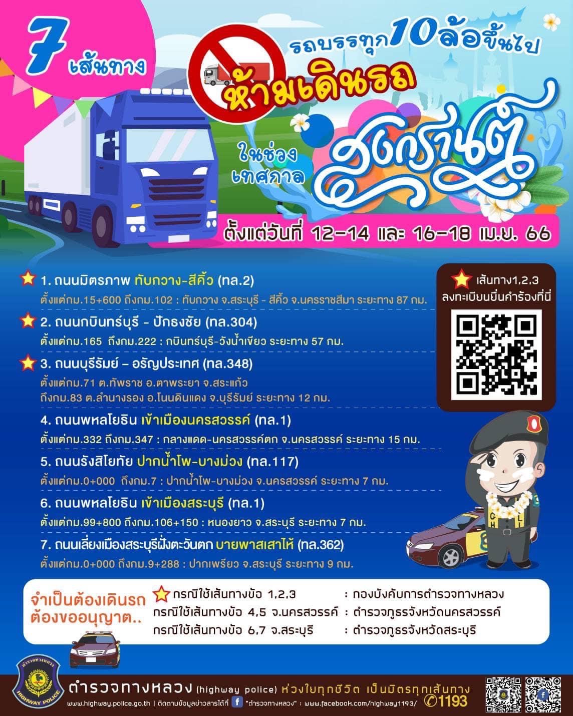 7เส้นทาง #ห้ามรถบรรทุกสิบล้อ ขึ้นไปเดินรถในช่วงเทศกาล สงกรานต์ 66ตั้งแต่ วันที่ 12-14 และ 16-18 เมษา