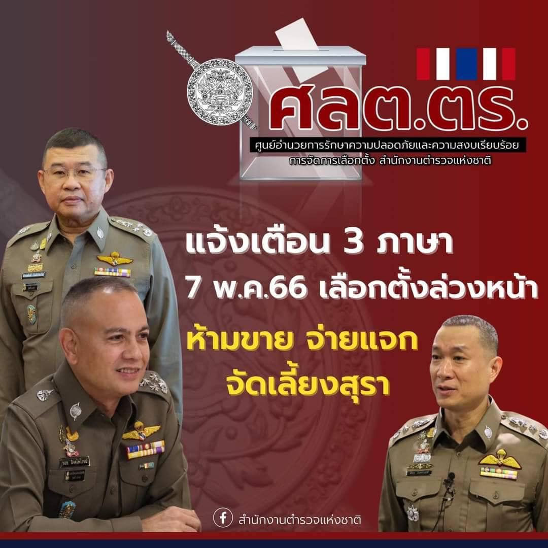 “ศลต.ตร.” แจ้งเตือน 3 ภาษา 7 พ.ค. เลือกตั้งล่วงหน้า ห้ามจำหน่าย จ่ายแจก จัดเลี้ยงสุราทุกชนิด ทั่วประ