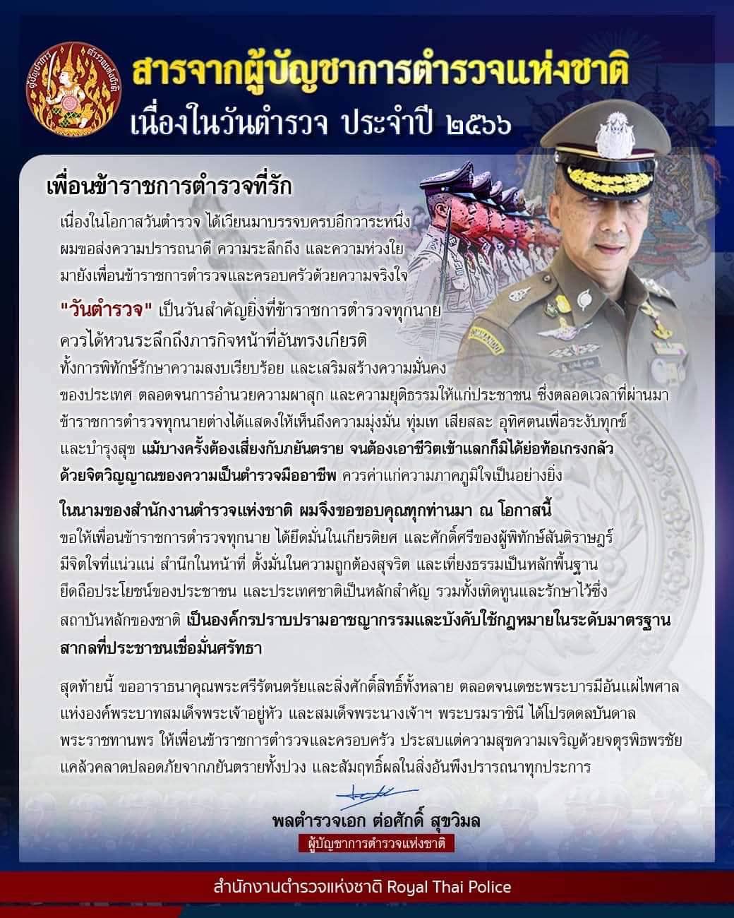 17 ตุลาคม “วันตำรวจ” สาร จาก “พลตำรวจเอก ต่อศักดิ์ สุขวิมล” ผู้บัญชาการตำรวจแห่งชาติ เนื่องในวันตำรว