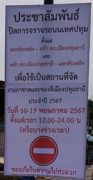 สภ.เมืองปทุมธานี แจ้งประชาสัมพันธ์ปิดการจราจร ถนนเทศปทุม เป็นการชั่วคราวเนื่องในกิจกรรมงานกาชาดจังหว