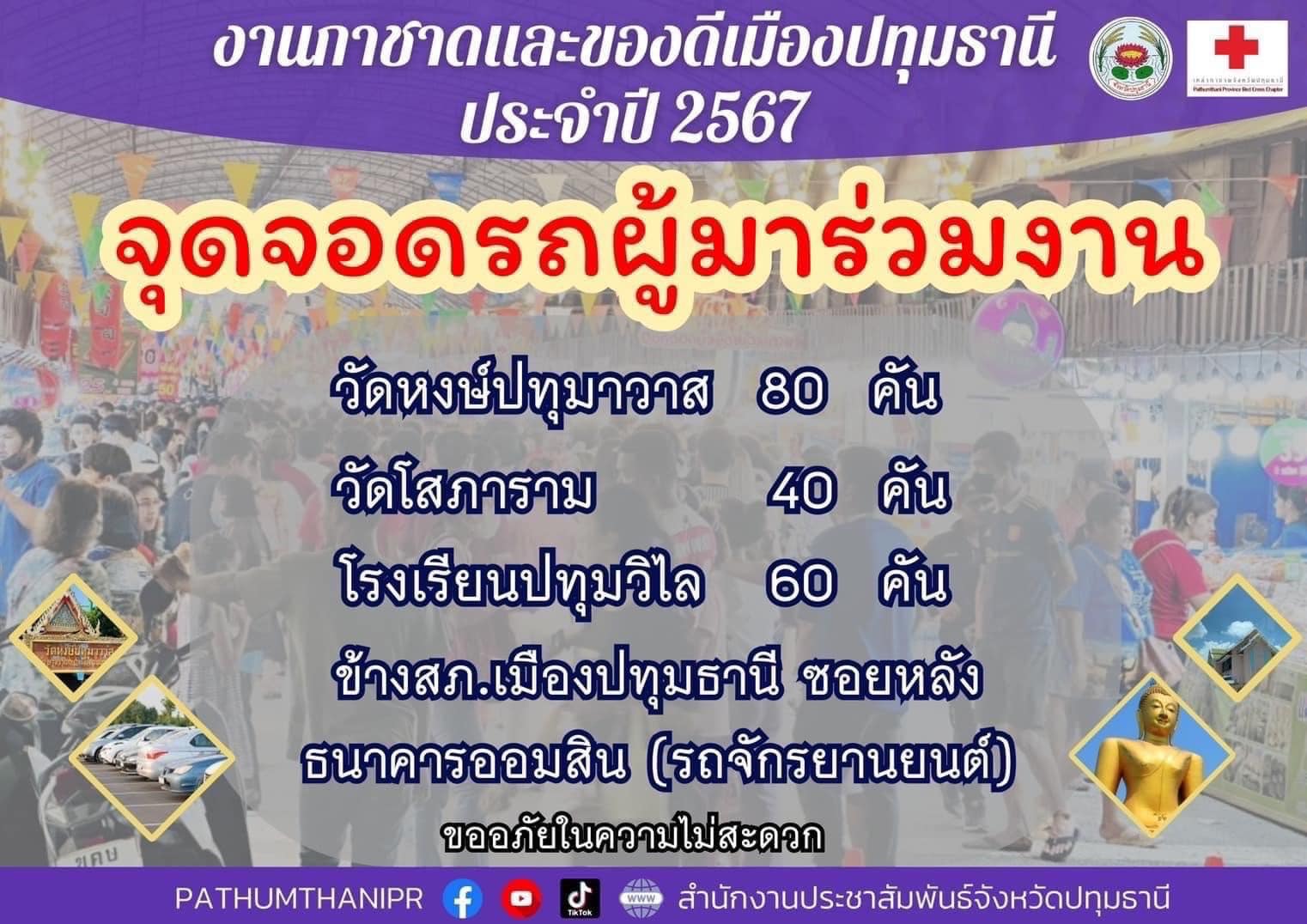 ประชาสัมพันธ์ จุดจอดรถสำหรับผู้มาร่วมงาน “ งานกาชาดและของดีเมืองปทุมธานี ประจำปี 2567 “ วันที่ 10 &#