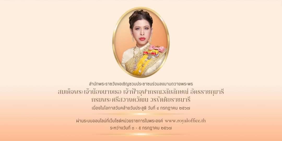 สำนักพระราชวัง ขอเชิญชวนประชาชนร่วมลงนามถวายพระพร สมเด็จพระเจ้าน้องนางเธอ เจ้าฟ้าจุฬาภรณวลัยลักษณ์ อ