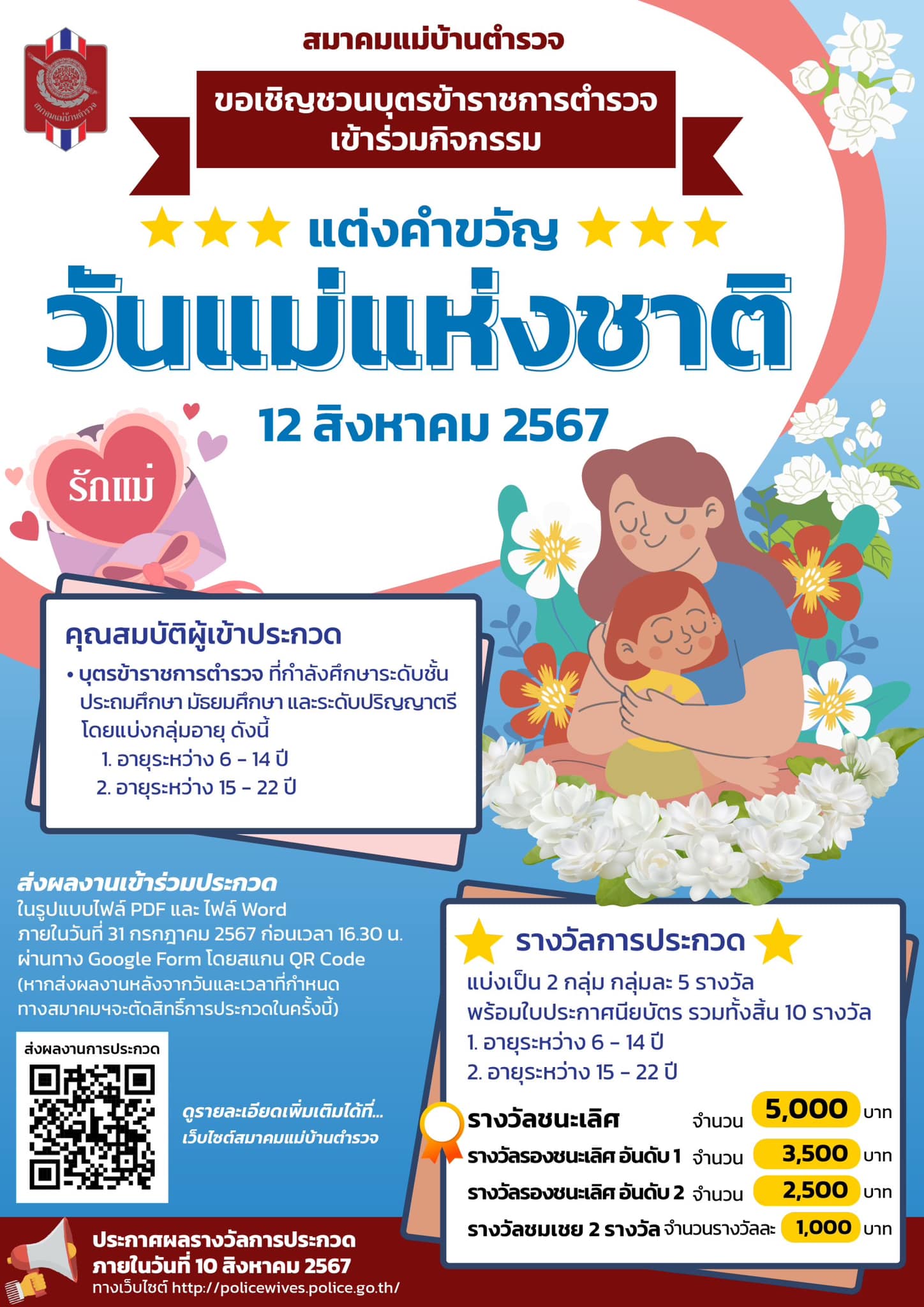 สมาคมแม่บ้านตำรวจจัดกิจกรรมประกวดแต่งคำขวัญ เนื่องในวันแม่แห่งชาติ 12 สิงหาคม 2567 เพื่อร่วมเทิดพระเ