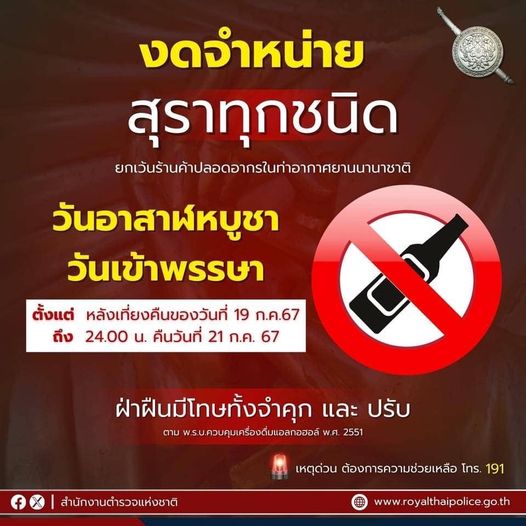 งดจำหน่าย สุราทุกชนิด วันอาสาฬหบูชา, วันเข้าพรรษา ตั้งแต่หลังเที่ยงคืนของวันที่ 19 ก.ค.67 ถึง 24.00
