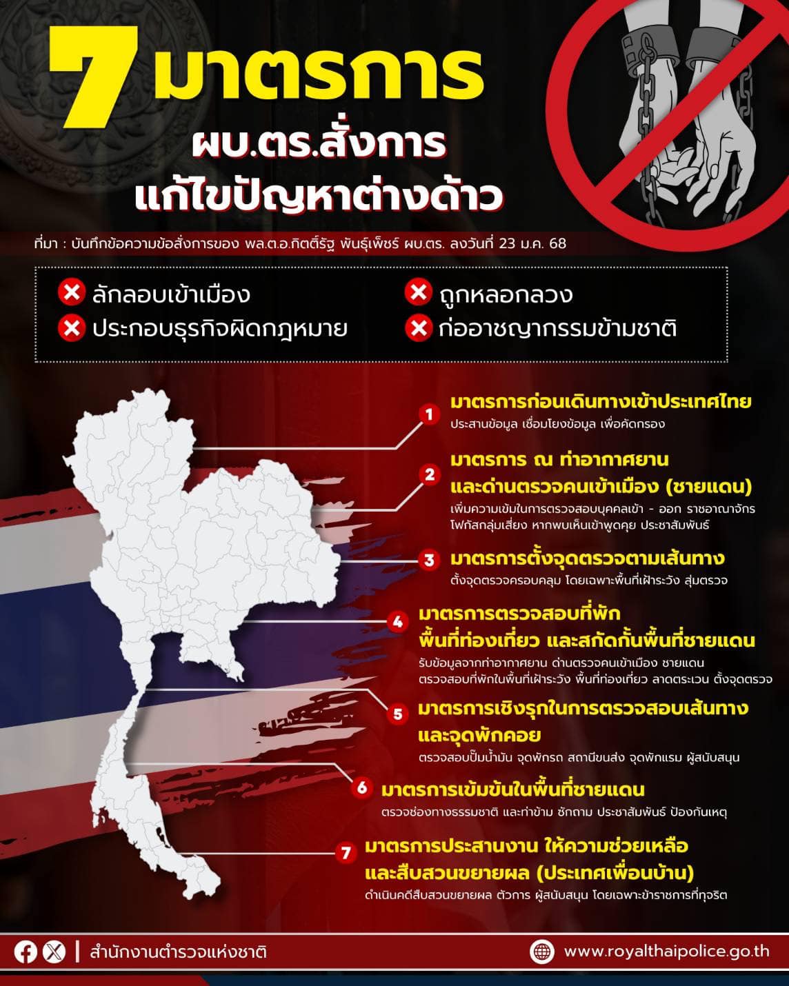 ผบ.ตร.บังคับใช้ 7 มาตรการเข้มข้น แก้ไขปัญหาคนต่างด้าวลักลอบหลบหนีเข้าเมือง ถูกหลอกลวง หรือประกอบธุรกิจผิดกฎหมาย และอาชญากรรมข้ามชาติ ย้ำชัดให้เห็นผลภายใน 7 วัน หากพบเจ้าหน้าที่มีเอี่ยวหรือบกพร่อง ฟันเด็ดขาด
