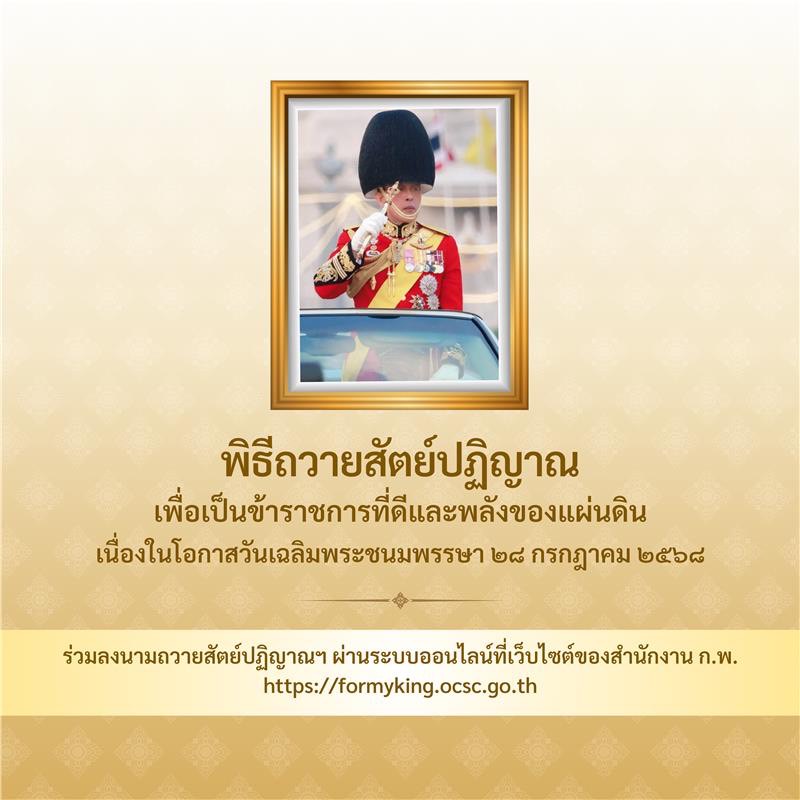 ขอเชิญชวนหน่วยงานจัดให้มีการถวายสัตย์ปฏิญาณเพื่อเป็นข้าราชการที่ดีและพลังของแผ่นดิน สำหรับข้าราชการและเจ้าหน้าที่ ณ ที่ตั้งของหน่วยงาน ระหว่างวันที่ 20 – 28 กรกฎาคม 2568 และขอเชิญชวนข้าราชการ เจ้าหน้าที่ของรัฐ และประชาชน ร่วมลงนามถวายสัตย์ปฏิญาณเพื่อเป็นข้าราชการที่ดีและพลังของแผ่นดิน ตั้งแต่บัดนี้ – 31 กรกฎาคม 2568