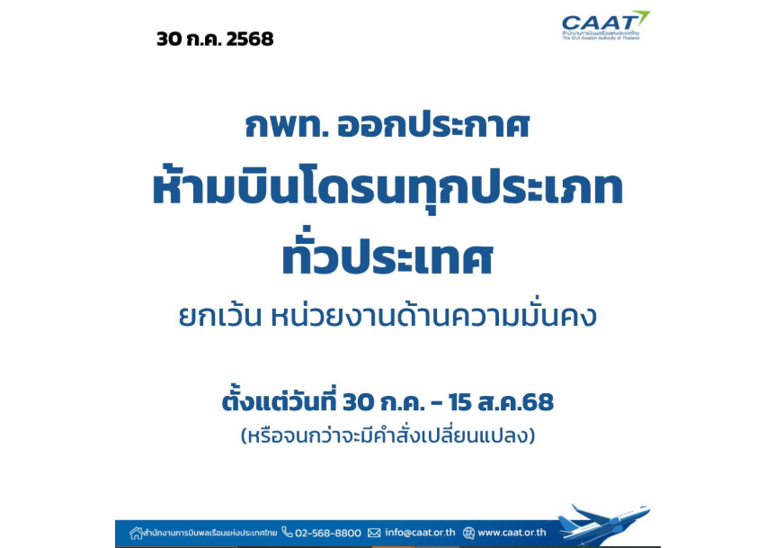 ประชาสัมพันธ์ สำนักงานการบินพลเรือนแห่งประเทศไทย ออกประกาศเรื่อง ห้ามบังคับหรือปล่อยอากาศยานซึ่งไม่มีนักบิน ประเภทอากาศยานที่ควบคุมการบินจากภายนอก (Drone) ช่วงสถานการณ์ชายแดนไทย – กัมพูชา ตั้งแต่วันที่ 30 ก.ค. – 15 ส.ค.68