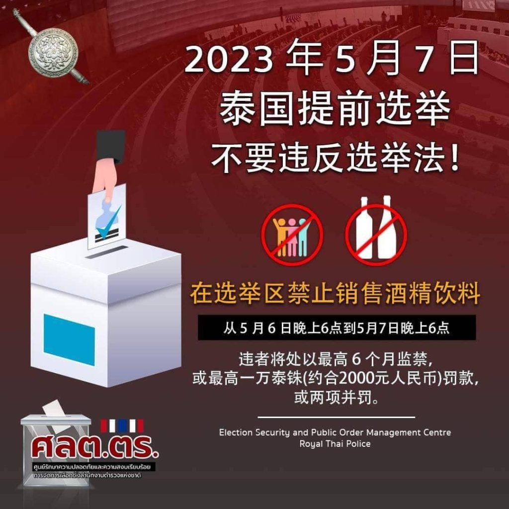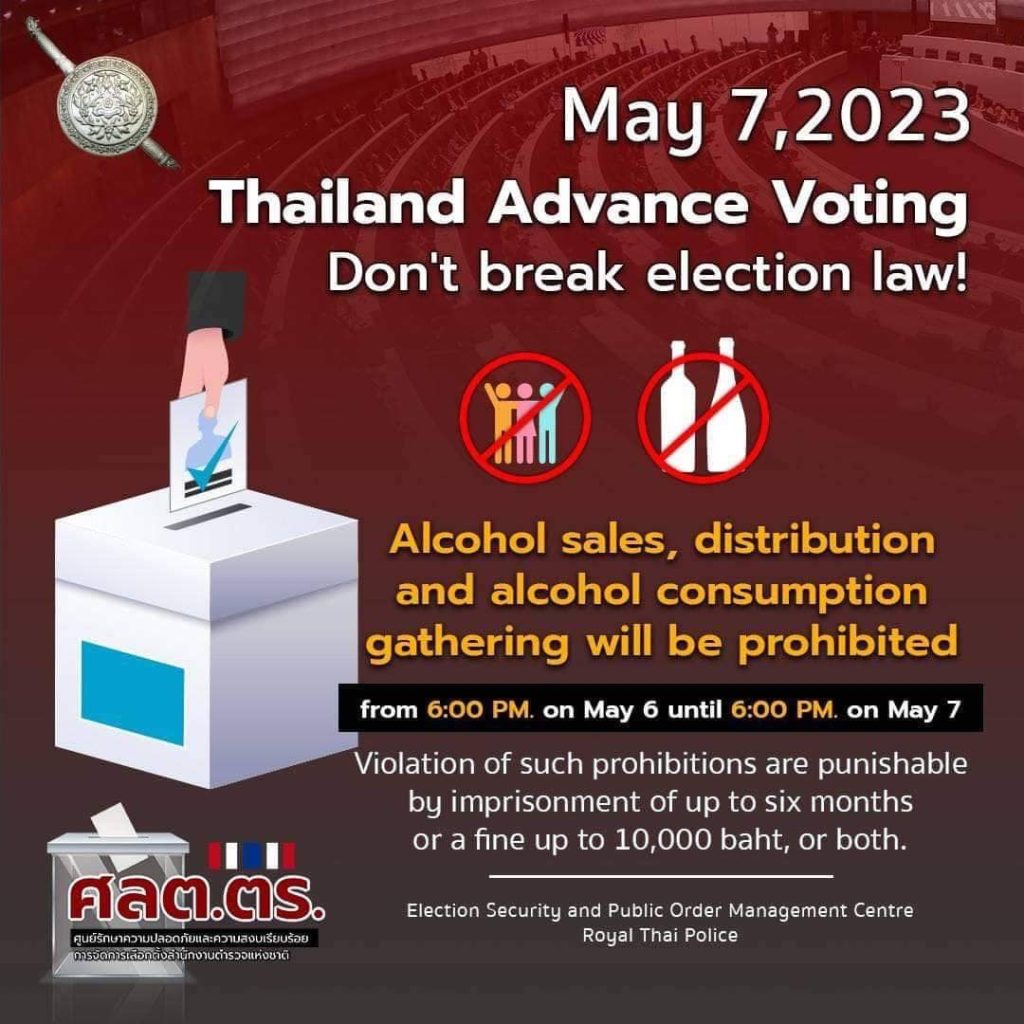 คณะกรรมการการเลือกตั้ง ( กกต. ) ได้ประกาศว่า ห้ามขาย จำหน่าย จ่ายแจก หรือจัดเลี้ยงสุราทุกชนิด ตั้งแต่ 18.00 น. ของวันที่ 6 พฤษภาคม 2566 จนถึงเวลา 18.00 น. ของวันที่ 7 พฤษภาคม 2566