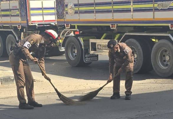 เจ้าหน้าที่จราจร เก็บกวาดเศษหินตกหล่นบนพื้นผิวการจราจร เพื่อป้องกันการเกิดอุบัติเหตุกับผู้ใช้รถใช้ถนน